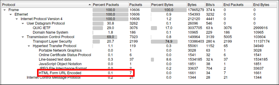 One thing that sticks out is the seven packets of ‘HTML Form URL Encoded’; that might be worth looking at.