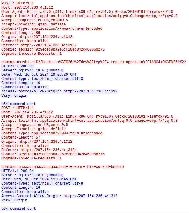 In addition to the reverse shell attempt, we can see that the server responded ‘b64 command sent’, and a second POST request with a hint that it din’t work.