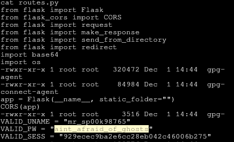 In the webroot directory we can se the document routes.py, which contains the backend for the login, made in Flask. Here we can see the hard coded credentials for the login. A password is always good to collect, as it might be reused somewhere (though that’s not the case in this challenge).