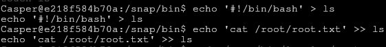 In this case, we can see that although the program (/snap/bin/ls) is owned by root, and we only have permission to execute and read, the directory /snap/bin has write permission for all set. This means that although we can’t manipulate the contents of the file, we can do things like rename, move, or delete it, and so we can replace it with a shell script which we then can run in sudo!